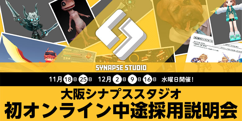 シナプススタジオは、クリーク・アンド・リバー社 大阪支社を拠点とする、ゲーム・遊技機開発専門のクリエイティブスタジオです。 様々な職種のクリエイターが集結し、大手ゲームメーカーとの共同開発や運営、2D、3DCGの受託制作などを行っています。