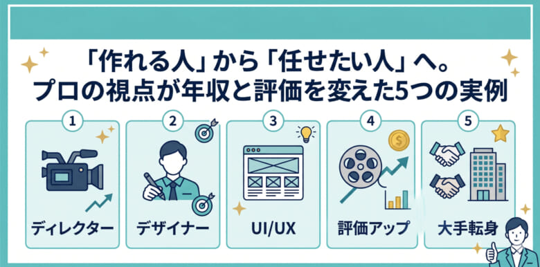 発注側が本当に求めているのは、「技術を持った人」ではなく、「企画の意図を汲み取り、映像でビジネス課題を解決できるパートナー」です。つまり、「なぜその演出なのか(Why)」を語れる人材。プロの転職エージェントが介入することで、すでに持っているスキルを「別の言語」に翻訳し、市場評価が大きく変わった事例が数多くあります。以下の5つの実例を、あなた自身のキャリアと重ね合わせながら読み進めてみてください。