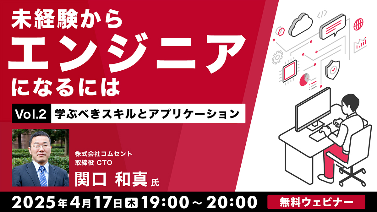 第2回目となる今回のウェビナーでは、実際にエンジニアとしても活躍されている、関口和真氏に、未経験からエンジニアを目指すために参考となる「まず最初に学ぶべきスキル」や「学ぶべきアプリケーション」、「参考になるサイトや書籍、勉強方法」などについて分かりやすくお話しいただきます。
