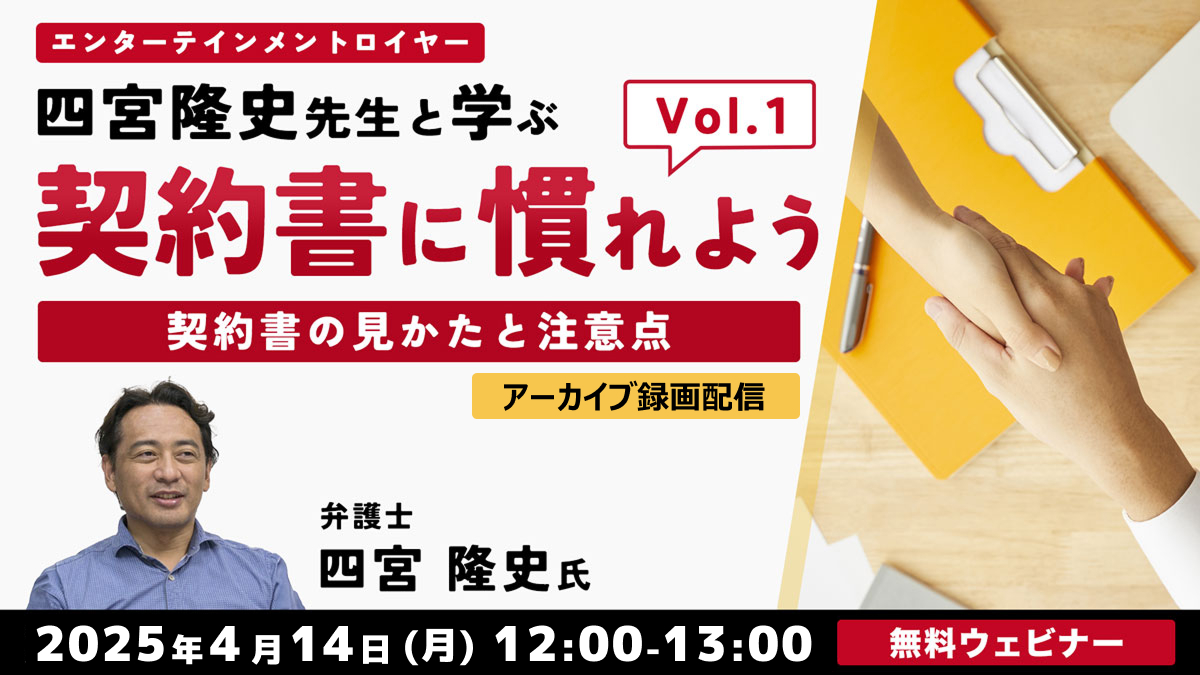 クリーク・アンド・リバー社(C&R社)は2025年4月14日(月)12時から、2025年2月17日(月)に実施した【契約書に慣れよう! エンターテインメントロイヤー四宮隆史先生と学ぶ ~契約書の見かたと注意点~Vol.1】のアーカイブ録画配信を実施します。