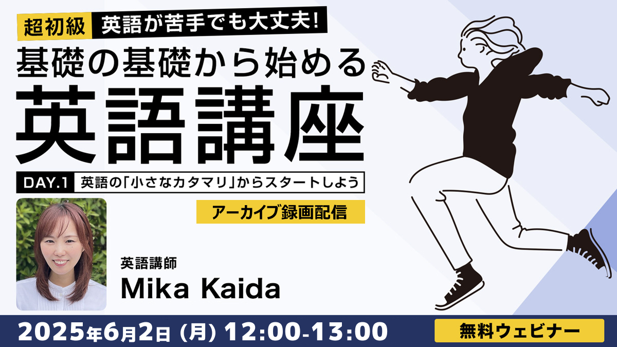 クリーク・アンド・リバー社(C&R社)は 2025年6月2日(月)12時から、 2025年3月12日(水)に実施した、【【超初級】英語が苦手でも大丈夫!基礎の基礎から始める英語講座 Day 1:英語の「小さなカタマリ」からスタートしよう】のアーカイブ録画配信を実施します。
