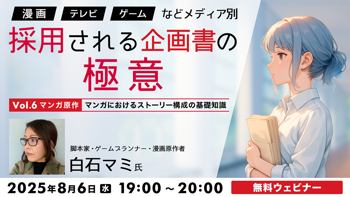 漫画、テレビ、ゲームといったエンタメ業界でジャンルを超えて仕事をするには、採用される企画書の制作が不可欠です。このウェビナーでは、テレビシナリオ・漫画原作・ゲームシナリオと、多岐にわたり活躍してきたクリエイターが、それぞれのメディアで必要とされるスキルと、採用される企画書の作り方について解説します。