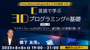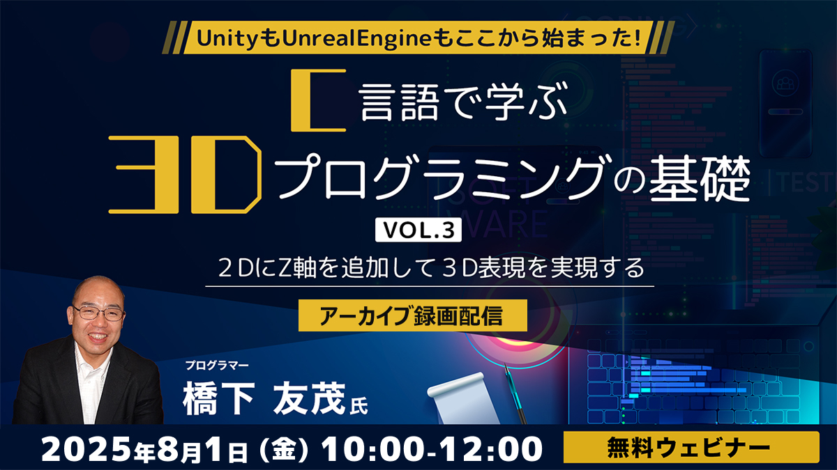クリーク・アンド・リバー社(C&R社)は2025年8月1日(金)10時~2025年6月4日(水)に実施した【UnityもUnrealEngineもここから始まった!! C言語で学ぶ3Dプログラミングの基礎 Vol.3 ~2DにZ軸を追加して3D表現を実現する~】のアーカイブ録画配信を実施します。