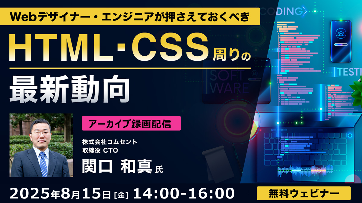 クリーク・アンド・リバー社(C&R社)は2025年8月15日(金)14時から、2025年3月4日(水)に実施した【Webデザイナー・エンジニアが押さえておくべき HTML・CSS周りの最新動向】のアーカイブ録画配信を実施します。