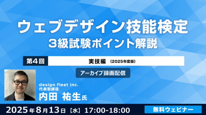 ※8月13日(水)に2025年4月~5月に実施したウェブデザイン技能検定ポイント解説第1回~第4回のアーカイブ録画配信を実施します。