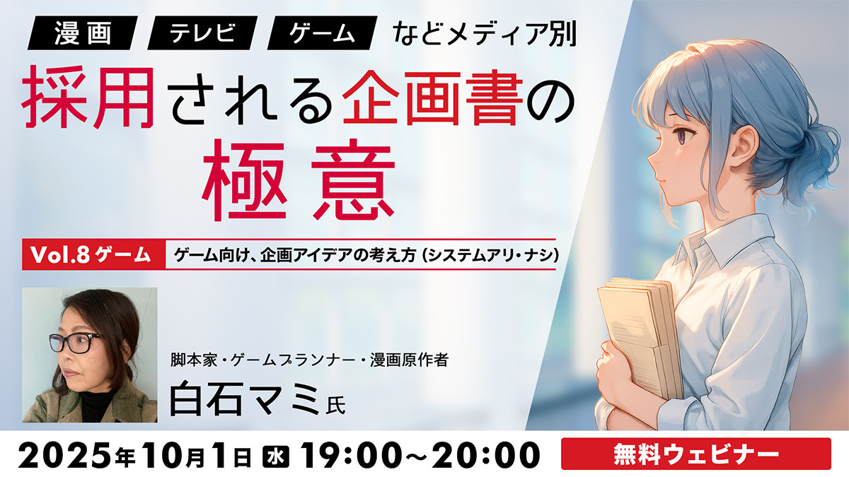 漫画、テレビ、ゲームといったエンタメ業界でジャンルを超えて仕事をするには、採用される企画書の制作が不可欠です。このウェビナーでは、テレビシナリオ・漫画原作・ゲームシナリオと、多岐にわたり活躍してきたクリエイターが、それぞれのメディアで必要とされるスキルと、採用される企画書の作り方について解説します。