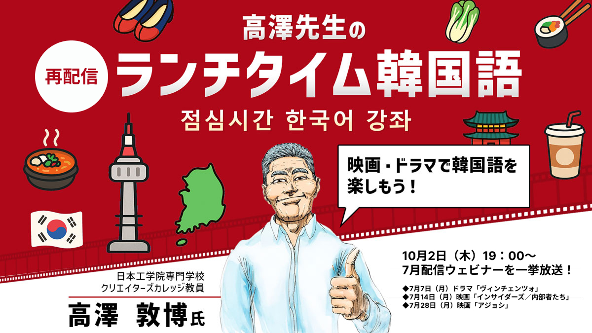 クリーク・アンド・リバー社(C&R社)は 2025年10月2日(木)19時から、 2025年7月に配信した、【高澤先生のランチタイム韓国語 映画・ドラマで韓国語を楽しもう!】を3本一挙配信いたします。