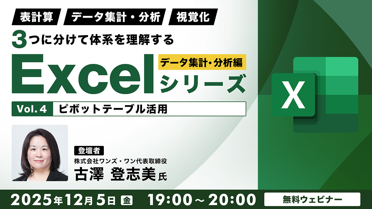 クリーク・アンド・リバー社(C&R社)は、2025年12月5日(金)に、Excelの機能を「表計算ソフト」から「データ集計ツール」として再認識し、より効果的に活用するための知識を身に着けていただける「3つに分けて体系を理解するExcelシリーズ」のデータ集計・分析編 Vol.4を開催します。