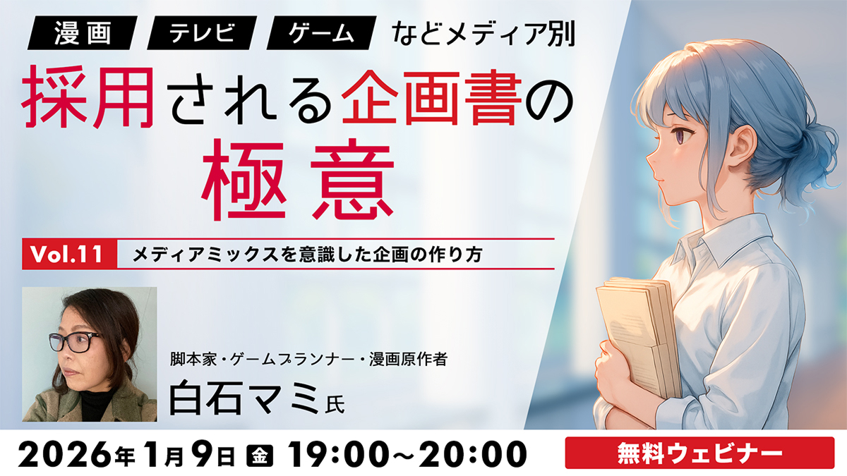 漫画、テレビ、ゲームといったエンタメ業界でジャンルを超えて仕事をするには、採用される企画書の制作が不可欠です。このウェビナーでは、テレビシナリオ・漫画原作・ゲームシナリオと、多岐にわたり活躍してきたクリエイターが、それぞれのメディアで必要とされるスキルと、採用される企画書の作り方について解説します。