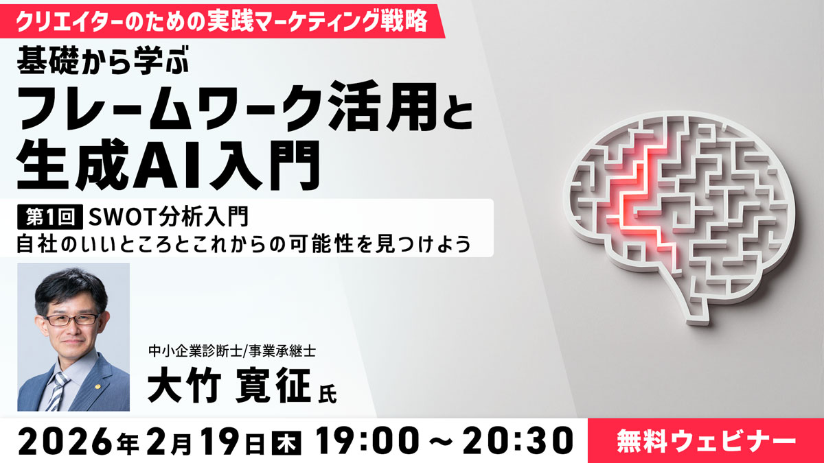 クリーク・アンド・リバー社(C&R社)は、2026年2月19日(木)に、クリエイター・個人事業主の方を対象としたマーケティングの基礎と生成AIの実践的な活用方法を学ぶウェビナーを開催します。