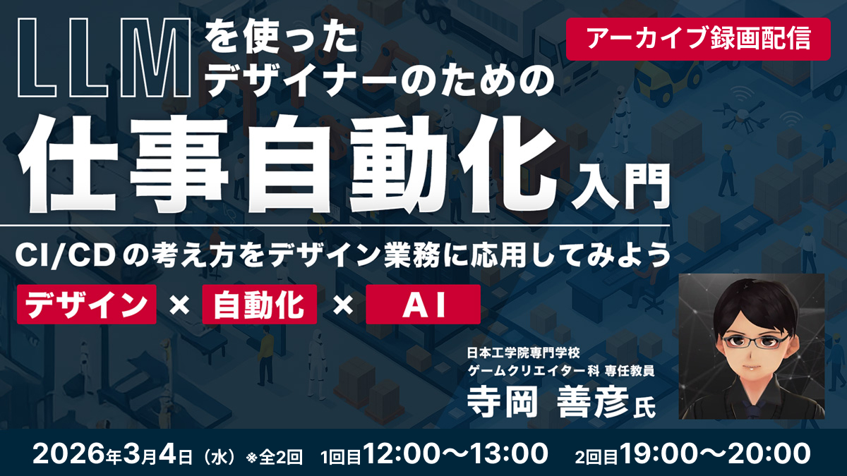 クリーク・アンド・リバー社(C&R社)は 2026年3月4日(水)12時からと19時から、2025年9月10日(水)・17日(水)に実施した、【【デザイン × 自動化 × AI】 LLMを使ったデザイナーのための“仕事自動化”入門 〜CI/CDの考え方をデザイン業務に応用してみよう〜】のアーカイブ録画配信を実施します。