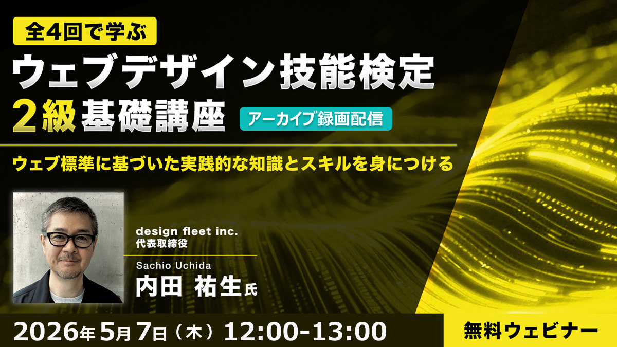 クリーク・アンド・リバー社(C&R社)は 2026年5月7日(木)12時から、2026年1月9日(金)に実施した、【全4回で学ぶウェブデザイン技能検定2級基礎講座 ~ウェブ標準に基づいた実践的な知識とスキルを身につける~第1回:インターネット概論・法務】のアーカイブ録画配信を実施します。