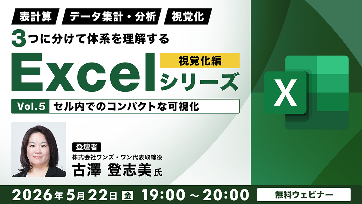 クリーク・アンド・リバー社(C&R社)は、2026年5月22日(金)に、Excelの機能を「表計算ソフト」から「データ集計ツール」として再認識し、より効果的に活用するための知識を身に着けていただける「3つに分けて体系を理解するExcelシリーズ」の視覚化編 Vol.5を開催します。