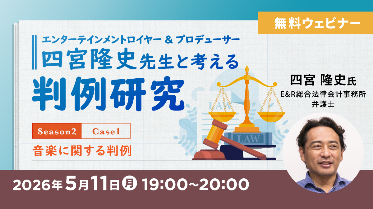 クリーク・アンド・リバー社(C&R社)は 2026年5月11日(月)に、エンターテインメント専門弁護士である四宮先生をお招きし、業界で働いていらっしゃる方々、これから業界を目指す方々に向けて、業界で活躍していくためにクリエイターに知ってほしい事例について判例を基に、わかりやすくお話しいただくオンラインセミナーを実施します。