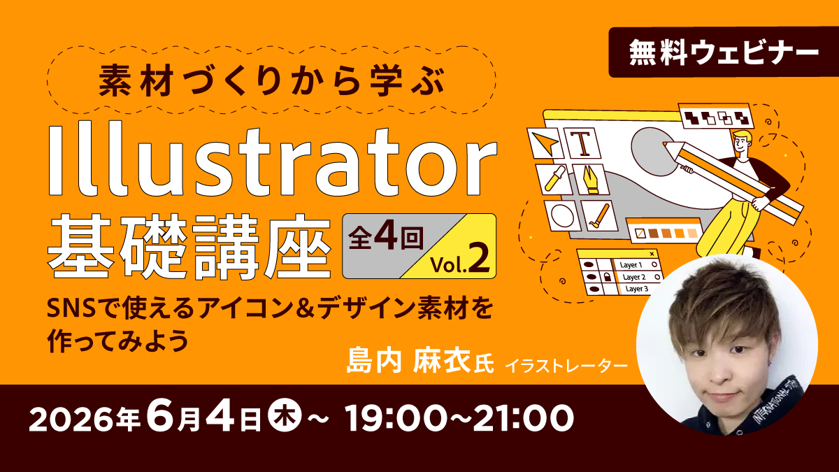 本講座では、Vol.1の構成をベースに、前半でIllustratorの基本操作をじっくり学び、後半ではSNSで使える アイコンやアイキャッチ制作にチャレンジします。