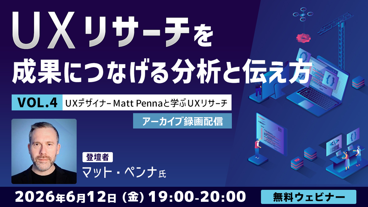 クリーク・アンド・リバー社(C&R社)は 2026年6月12日(金)19時から、2025年7月19日(土)に実施した、【UXデザイナーMatt Pennaと学ぶ「UXリサーチ」Vol.4 UXリサーチを成果につなげる分析と伝え方】のアーカイブ録画配信を実施します。