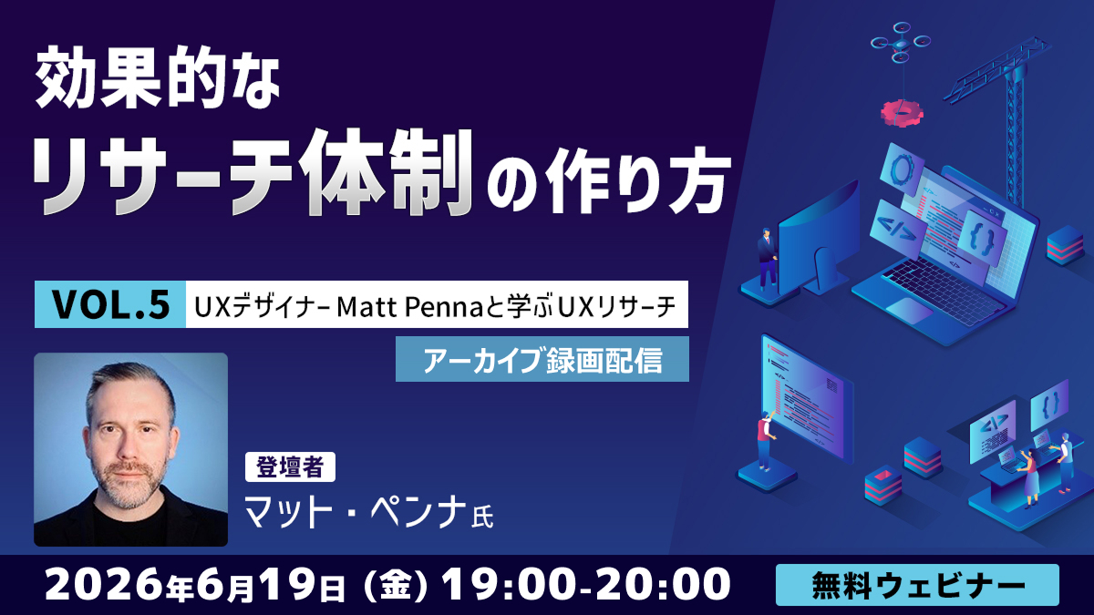 クリーク・アンド・リバー社(C&R社)は 2026年6月19日(金)19時から、2025年8月16日(土)に実施した、【UXデザイナーMatt Pennaと学ぶ「UXリサーチ」Vol.5 効果的なリサーチ体制の作り方】のアーカイブ録画配信を実施します。