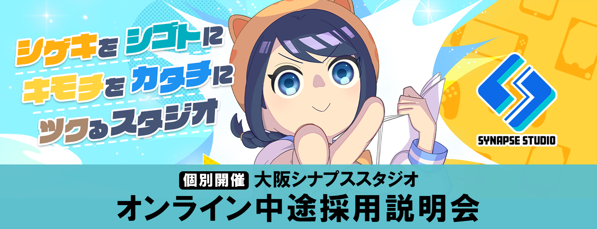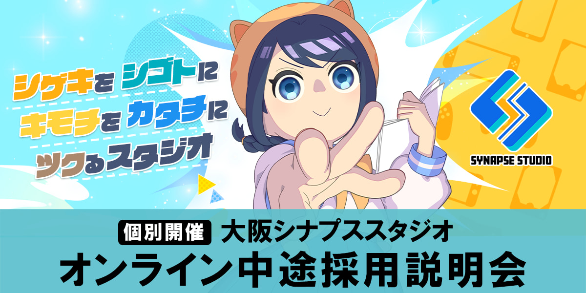 シナプススタジオは、クリーク・アンド・リバー社 大阪支社を拠点とする、ゲーム・遊技機開発専門のクリエイティブスタジオです。 様々な職種のクリエイターが集結し、大手ゲームメーカーとの共同開発や運営、2D、3DCGの受託制作などを行っています。
