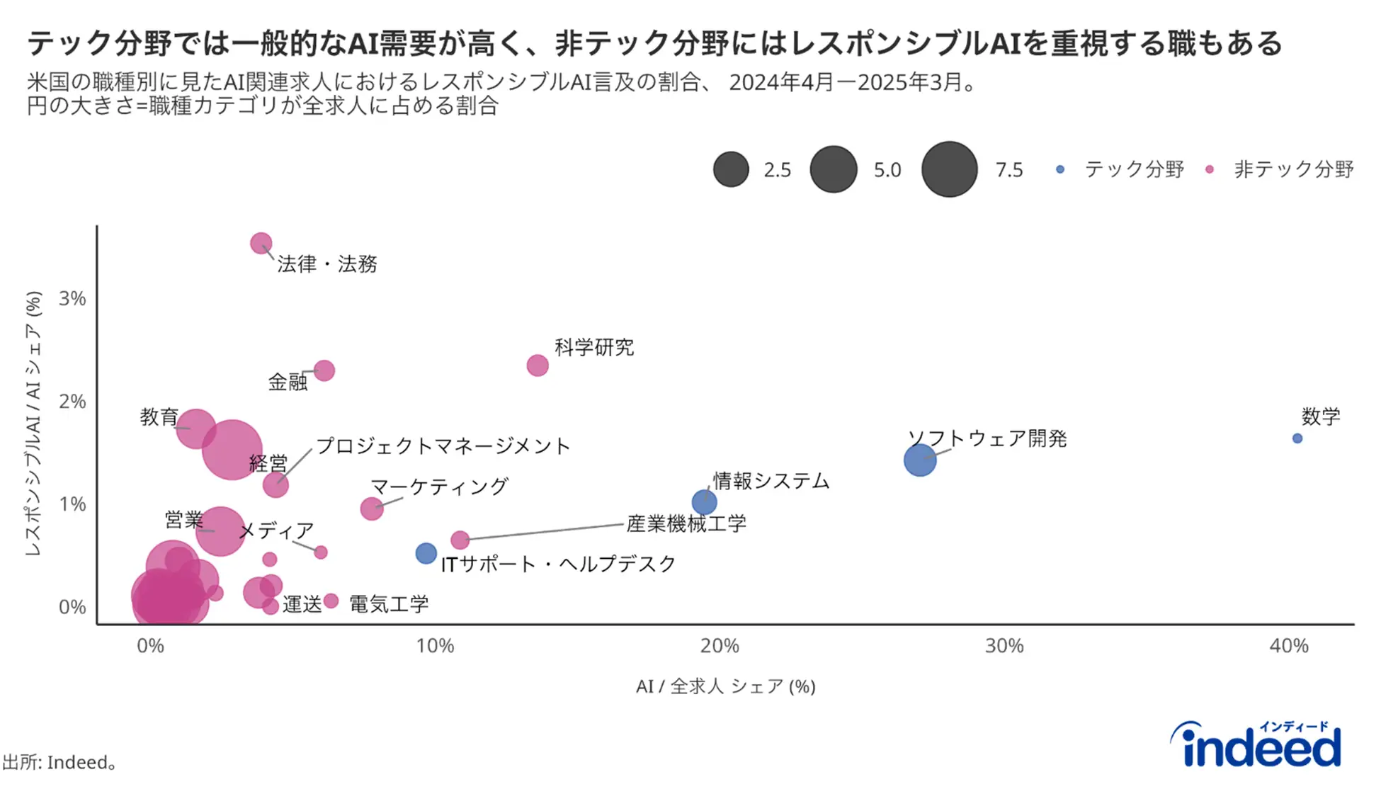 世界最大級の求人サイト「Indeed」の経済調査機関であるIndeed Hiring Labが、AI活用における倫理性や安全性などを重視する「責任あるAI(レスポンシブルAI)」に関する国際的な求人動向を分析したレポートを発表した。米国や欧州を中心に、AI関連求人の中で「レスポンシブルAI」に言及する案件が着実に増加しており、特に法務、金融、研究開発といった職種で顕著な伸びを見せている。