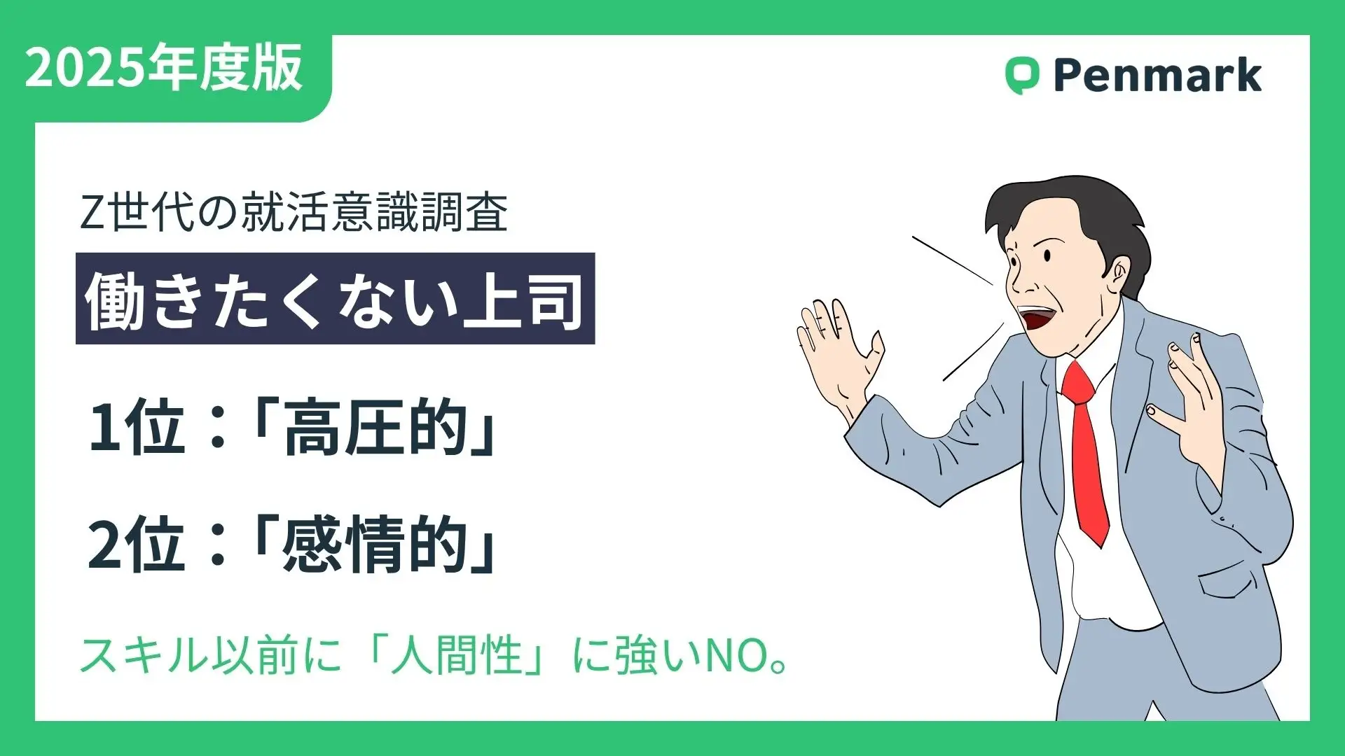 株式会社ペンマーク(本社:東京都目黒区、代表取締役:横山直明)は、全国の若手社会人を対象に「この人の下では働きたくない」と感じる上司の特徴に関する意識調査を実施した。調査対象は1996年から2005年生まれのいわゆるZ世代で、有効回答数は176名。Z世代の働き方や価値観が注目されるなか、上司に対する評価基準が明らかになった。