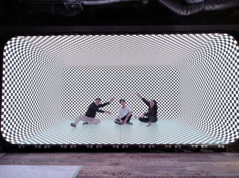没入型LEDブースは、日本国内初導入(※)となる曲面LEDパネルを用いた体験型LED空間です。正面と左右の3面に配置された曲面ディスプレイにより、視野全体を包み込む映像演出が可能で、これまでにない立体的かつシームレスな没入体験を実現します。さらに高い耐荷重性能を備えており、人物・什器の設置も可能。今回のようにトークコンテンツの収録スタジオとして活用するほか、ポップアップイベントやプロモーション、アート展示、ゲーム体験ブースなど多様なシーンでの展開が可能となります。