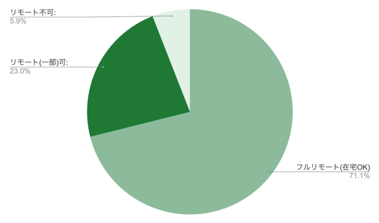 フルリモートが71.1%、一部リモート可が23.0%と、合計94.1%の案件でリモートワークが可能となっている。これは他の職種と比べても非常に高い水準で、フロントエンド開発が成果物で評価されやすく、場所に依存しない業務特性を持っていることを示している。都市部に住んでいなくても高単価案件にアクセスでき、ライフスタイルに合わせた柔軟な働き方を実現できるのは、フロントエンドエンジニアの大きな魅力といえるでしょう。リモート不可はわずか5.9%に留まっており、選択肢の幅広さも際立っている。