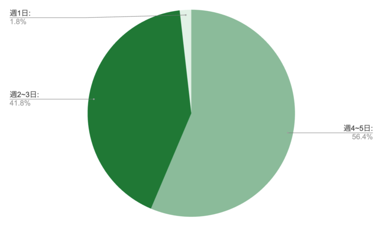 週4~5日が56.4%と過半数を占める一方で、週2~3日も41.8%と高い割合を示している。柔軟な働き方を実現しやすい職種であることを表しており、フルタイムでがっつり稼ぎたい人から、副業や他の活動と両立させたい人まで、多様なニーズに対応できる案件が豊富にあることがわかる。リモートワークとの親和性が高く、成果物で評価されやすいフロントエンド開発の特性が、こうした働き方の選択肢の広さにつながっているといえるだろう。