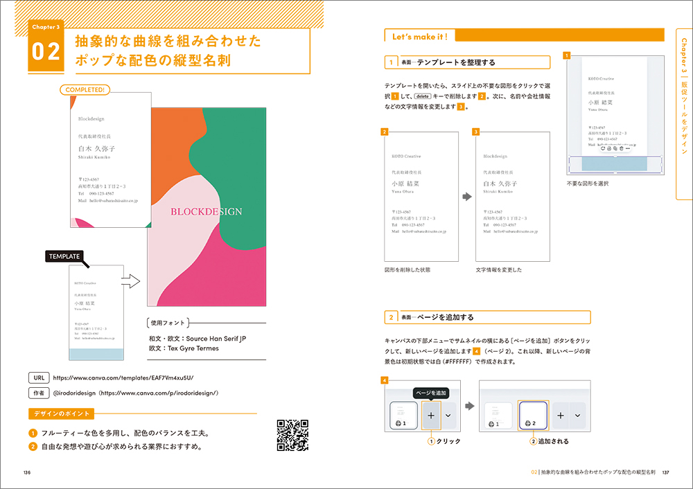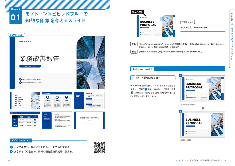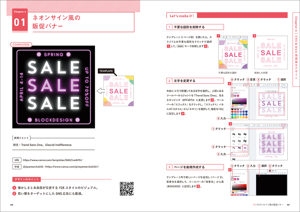 本書は、プレゼンスライドをはじめ、名刺、フライヤー、SNS投稿画像、バナー、サムネイルなど、ビジネスの現場で役立つ多様なデザインツールの制作手順を解説している。単に情報を整理するだけでなく、受け手の心を動かす「デザインの温度」や「遊び心」を大切にした、実践的なノウハウが満載だ。章構成は全4章で、Chapter1ではCanvaの基本的な操作方法を丁寧に説明。続くChapter2から4では、無料のテンプレートを活用した具体的な作例と制作プロセスを紹介しており、ノンデザイナーでも直感的に理解できる構成になっている。