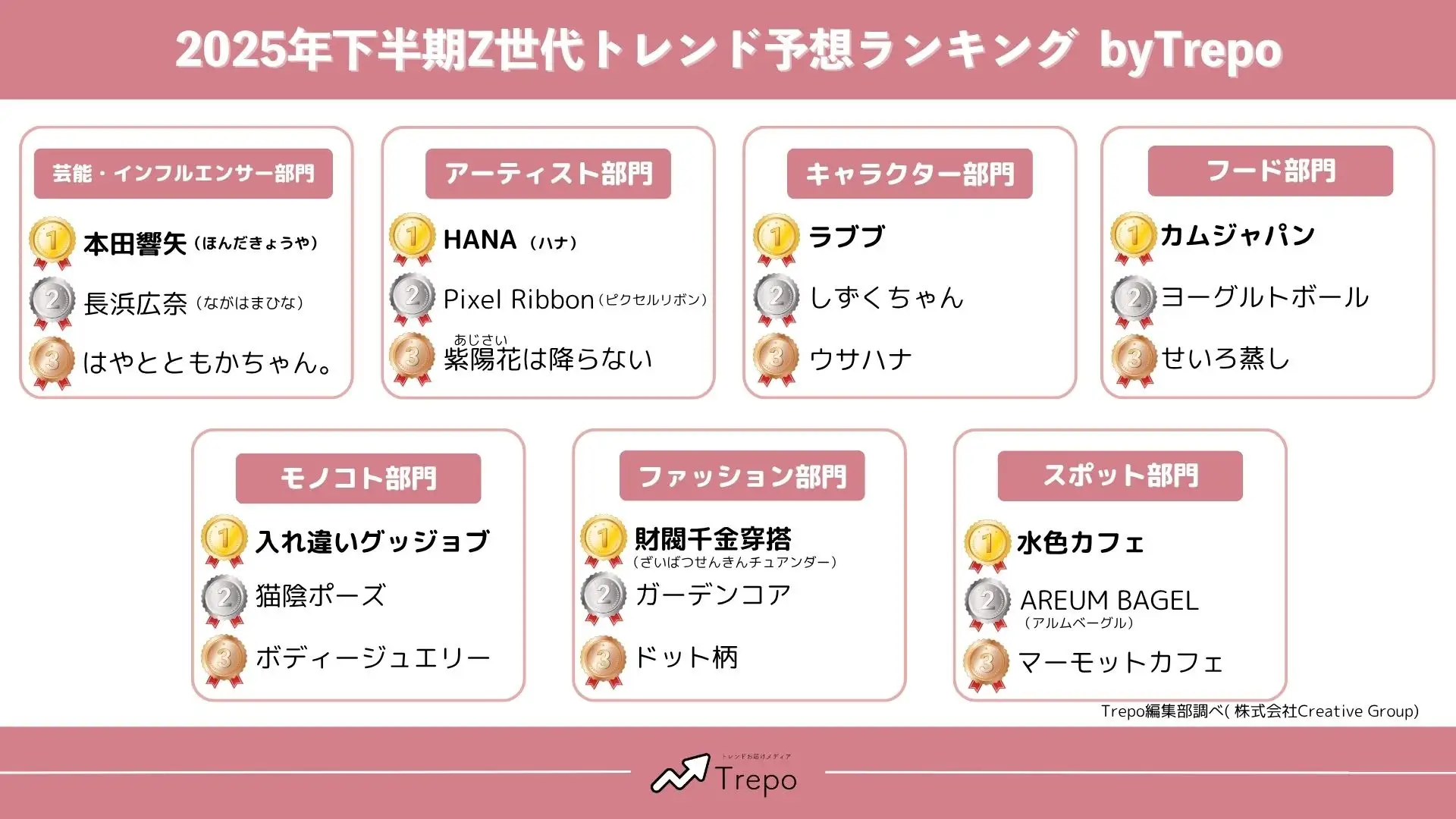 若者向けトレンドメディア「Trepo(トレポ)」を運営する株式会社Creative Group(本社:東京都千代田区、代表取締役:中原一真)は、2025年下半期のZ世代トレンド予想ランキングを発表した。10代から20代の女性読者「Trepo girls」および公式Instagramフォロワーを対象に、Webアンケート形式で調査を実施。注目されたのは、「芸能・インフルエンサー」「アーティスト」「キャラクター」「フード」「モノコト」「ファッション」「スポット」の7部門におけるZ世代の支持を集める人物やアイテムだ。