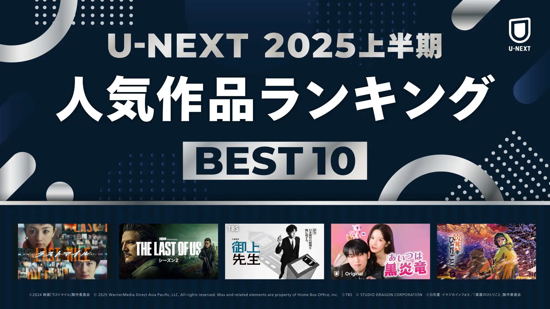動画配信サービス「U-NEXT」を運営する株式会社U-NEXT(本社:東京都品川区、代表取締役社長:堤天心)は、2025年7月11日、「U-NEXT 2025年上半期ランキング」を発表した。集計期間は2025年1月1日から6月8日までで、2024年12月1日以降に配信された新作のうち、視聴人数が多かった作品がジャンル別に選ばれている。