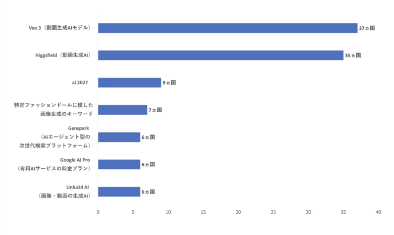 近年、AI技術の飛躍的な進化により、世界中でAIへの関心が高まっている。特に、今回の調査では、動画生成AIである「Veo 3」や「Higgsfield」というキーワードが、各国・地域の検索トレンドのランキングにおいて上位となり、新たなAIモデルの登場と技術革新により、国際的に注目を集めていることが明らかになった。その他、「Genspark」というキーワードも注目を集めており、AIエージェントを搭載したアップデートによる、検索体験を変える新たなサービスとして、ユーザーの関心を集めました。さらに、「AI 2027」というキーワードは、AIが超人的知能(ASI)へと進化する可能性を示した、予測レポートへの注目を表しており、技術的な期待とともに、倫理的・哲学的な議論も活発化している。
