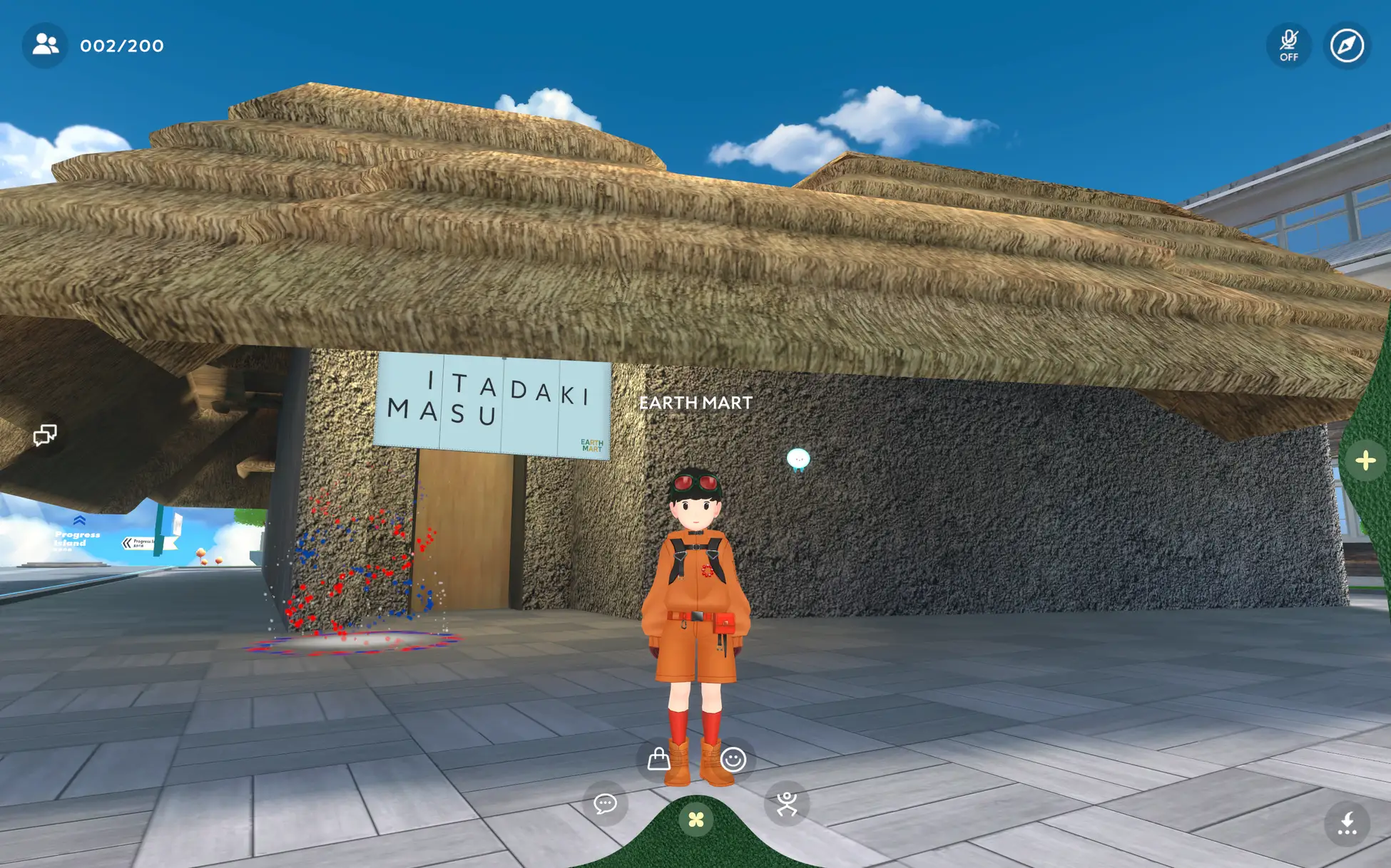 バーチャル会場内で「EARTH MART」へ向かうには、アプリ起動後に初期設定を完了し、画面右上のコンパスマークをクリック。「いのちの森の島 ワープする>>」を選び、ワープ先でカメラを右に向けると、茅葺屋根の建物が現れる。それが「EARTH MART」だ。